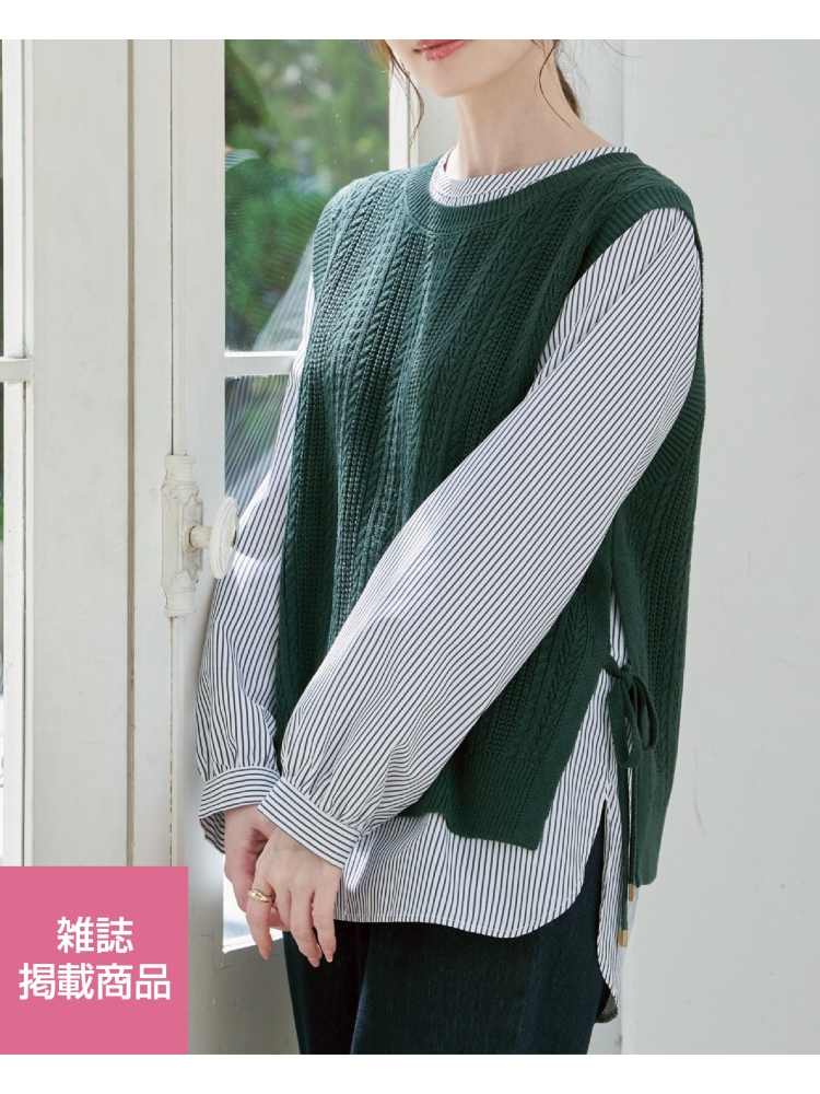 適度なハリ感のあるシャツ地、厚さを感じさせないニット深めのサイドスリットにリボンがアクセント。
