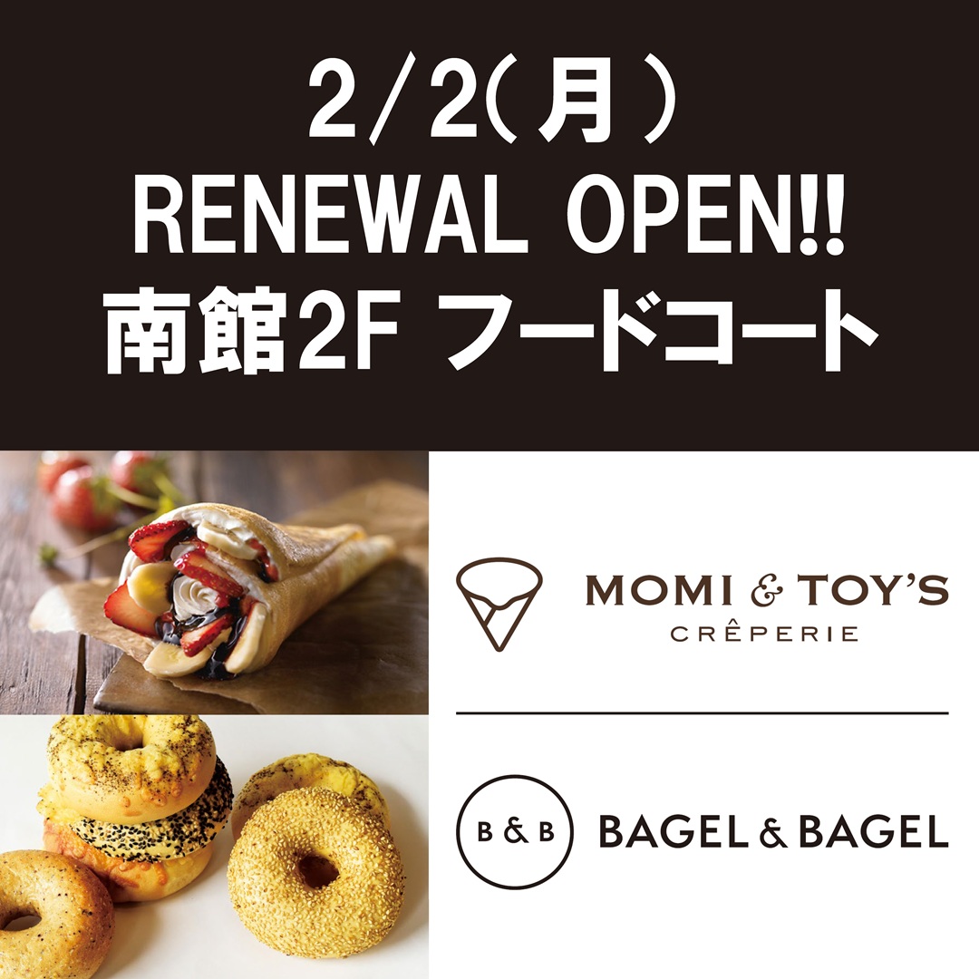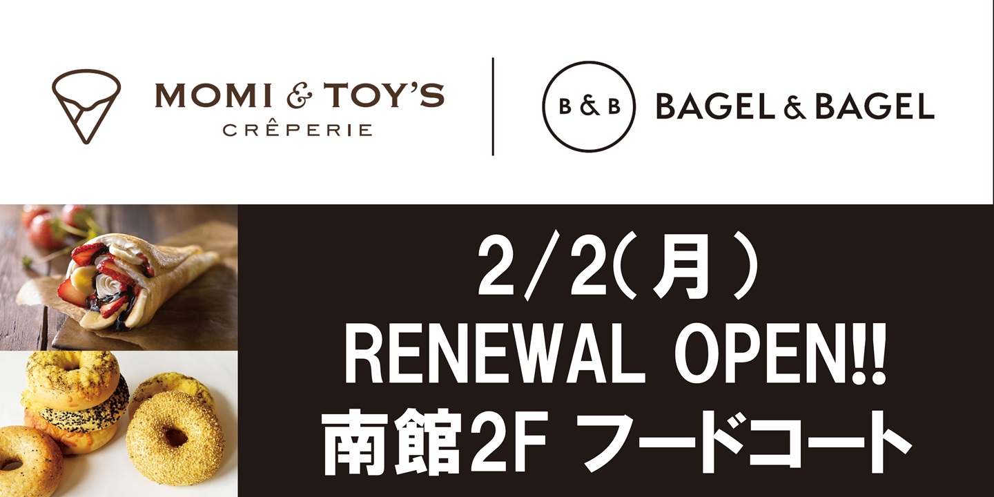南館2Fフードコート「MOMI&TOY'S/BAGEL & BAGEL」2月2日(月)リニューアルオープン
